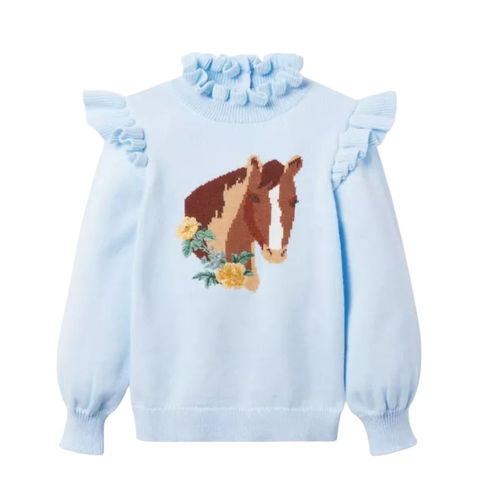 Janie and Jack Girls' Blue Ruffle Horse Sweater